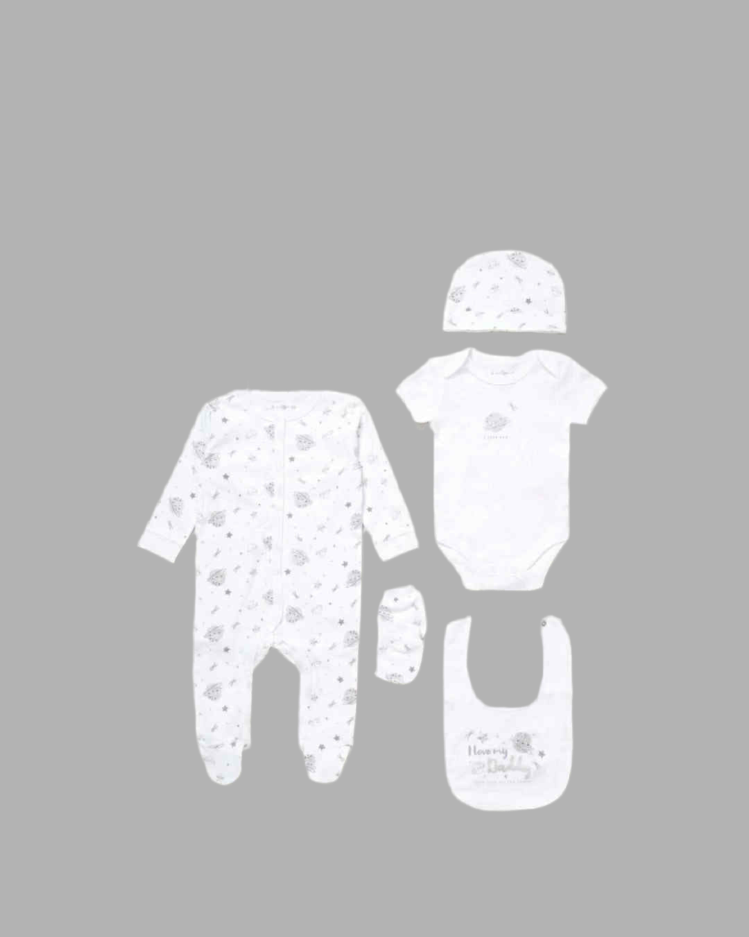 This White Gift Set is perfect for any new parent. Made of soft, high-quality cotton, this 5 piece set includes a romper, bib, bodysuit, hat, and mitts all featuring the endearing phrase "I Love My Daddy." Ideal for keeping baby comfortable and stylish.